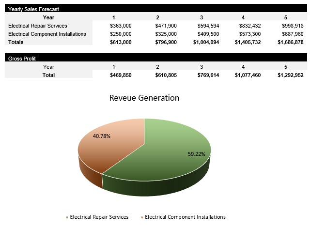 As has been one of the themes throughout this document, the demand for electrical contracting services will remain strong in any economic climate. Working with electricity is a hazardous activity, and only trained professionals that have a deep understanding of electrical systems are qualified to make these types of repairs. The Company will generate substantial contribution margins from both repair services as well as the installation of new electrical components.