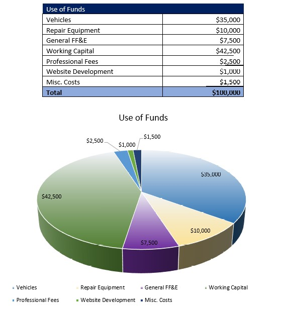 The Company is currently seeking to acquire $75,000 in order to launch operations. Matthew Wallace will contribute $15,000 towards the venture. This business plan assumes that the Company will receive a seven-year loan carrying a 7% interest rate.